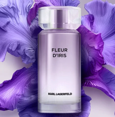 The cylindrical bottle, topped with a transparent cabochon-shaped cap, reflects the delicate hue of iris petals. The pale lilac shade also adorns the white outer packaging with its grainy leather texture, edged with black trimming, boldly displaying the fragrance name in large letters. Top Notes: Mandarin essence, orange blossom, Diviniris